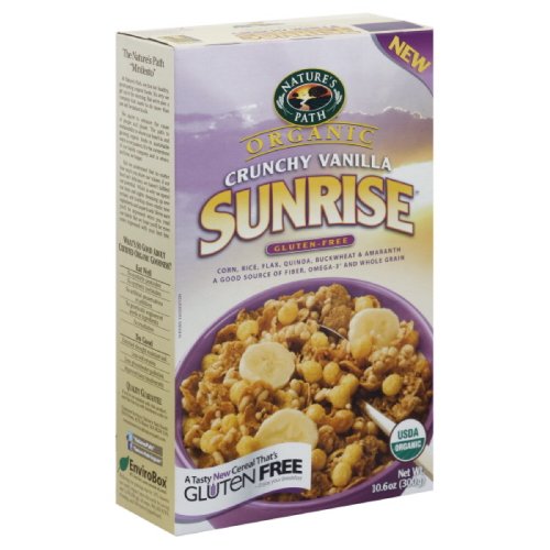 Nature’s Path organic Sunrise crunchy vanilla cereal is a delicious warm real vanilla breakfast cereal with a variety of crunchy textures from flakes, puffs, and crispies--a genuinely tasty gluten-free breakfast. Be sure, you will not have to lower your expectations even if you are eating a gluten-free, wheat-free breakfast. It contains the whole grain goodness of organic flax, buckwheat, and the ancient grains quinoa and amaranth. These were once the staples of Aztec and Peruvian homes and now you can enjoy their unique tastes and many nutritional benefits including omega-3 fatty acids. You do not have to settle for ordinary flakes or tasteless gluten-free cereal when Nature’s Path offers so much more--a pinch of this, a dash of that, but never anything artificial. This product contains no artificial additives, preservatives, or colors. Moreover, the USDA organic certification on this product means that the ingredients are grown without synthetic herbicides, pesticides, and nasty chemicals. This is a sacrifice-free way of enjoying your breakfast.